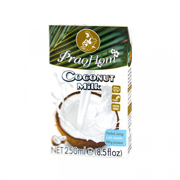 Mleko kokosowe firmy Prao Hom w kartoniku o pojemności 250ml. Zawartość tłuszczu 17-18%. Mleko kokosowe 100% z najlepszych gatunków kokosa. Dla uzyskania najlepszej jakości, każdy kokos jest starannie dobierany i dzięki zastosowaniu w procesie produkcji nowoczesnej technologii, zachowywany jest aromat, tekstura oraz smak świeżego mleka kokosowego, bez konserwantów. Powszechnie używane w kuchni orientalnej, najczęściej w kuchni tajskiej, indyjskiej oraz chińskiej. Służy do zagęszczania zup i sosów, duszenia mięsa, można je również stosować do kawy lub deserów. Mleczko kokosowe w kuchni tajskiej używane jest do potraw curry.