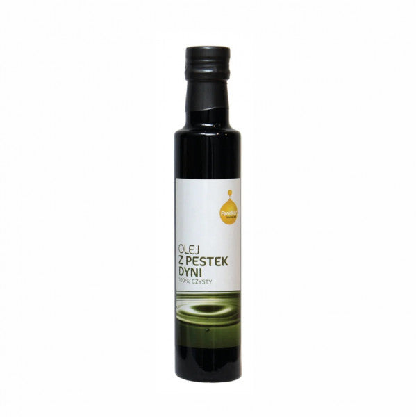 Olej z pestek dyni. Idealny do spożywania na surowo i do sałatek oraz jako dodatek do sosów, zup i ciast.